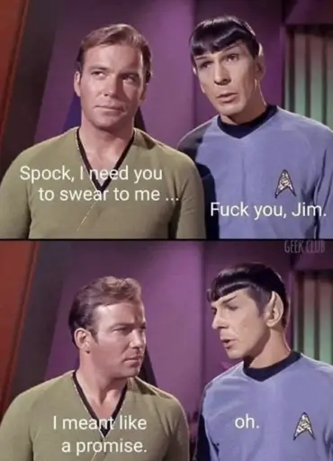 AngryishHumanoid@lemmynsfw.com · 25 minutes agoThe greatest trick the Vulcan Science Academy ever pulled...lemmynsfw.comimagemessage-square0linkfedilinkarrow-up13arrow-down10