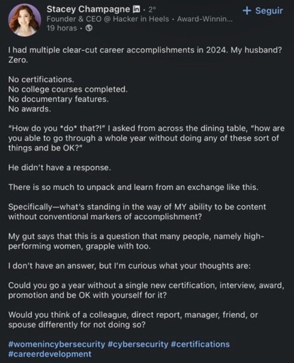 That’s the read I got from it too. She asks what’s keeping her from being content with life without conventional markers of accomplishment. I don’t think she says outright that she wants to be like her husband, but the point she’s making is that women in tech feel more driven to accomplish things as a way to prove themselves in the industry while men don’t feel that same pressure or not to the same extent.