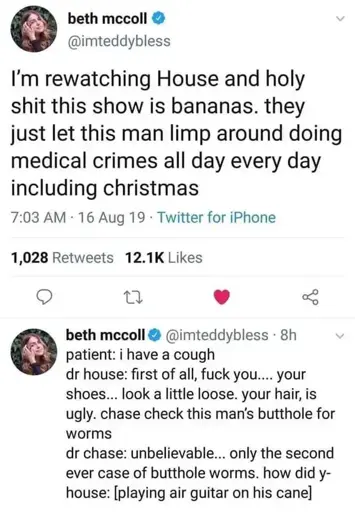 arrow-up11.05Karrow-down1imageAn accurate representation of House M.Dlemmy.dbzer0.comStamets@lemmy.dbzer0.com to People Twitter@sh.itjust.works · 2 months agomessage-square109linkfedilink