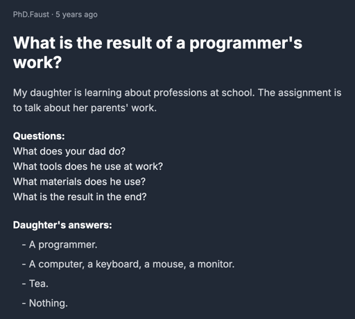 cm0002@sh.itjust.works to Programmer Humor@programming.dev · 22 days agoWhat is the result of a programmer's work?lemmy.mlimagemessage-square108linkfedilinkarrow-up1931arrow-down18cross-posted to: [email protected]