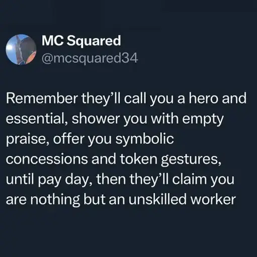 People should get living wages and there should be less wealth inequality, but this whole “essential worker” is just class warfare nonsense. Welcome to supply and demand, and the demand for “essential workers” went down. Happens a lot in the skilled labor market too, the answer isn’t “but I didn’t get mine’s!”, it’s thing like livable wages, having enough jobs, universal health care, universal income, all the things people at least began talking about before they were distracted into class warfare due to Big Data Cambridge Analytica troll factory disinformation campaigns by the ultrarich. Like I get people would be perfectly ok with leaving someone with a shit job in the trash just because they weren’t an “essential worker”, but they should try some empathy instead of thinking a label makes them special, whether it actually does or not.