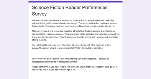 stressedmastersstudent to Science Fiction@lemmy.world · 3 months agoSF Reader Preferences Surveyplus-squaredocs.google.comexternal-linkmessage-square9linkfedilinkarrow-up136arrow-down11